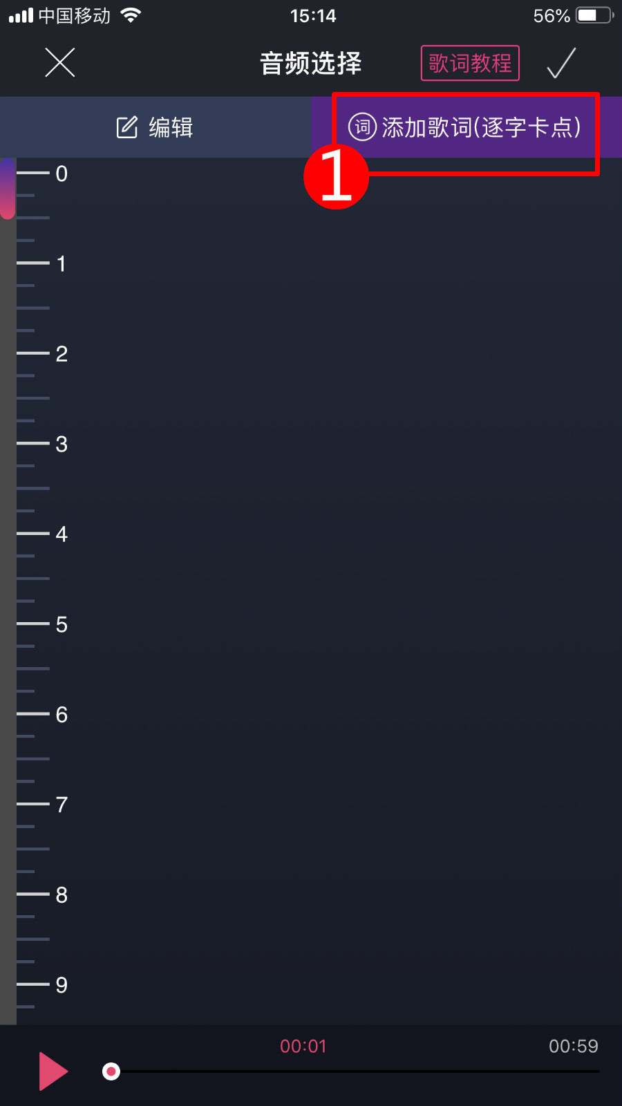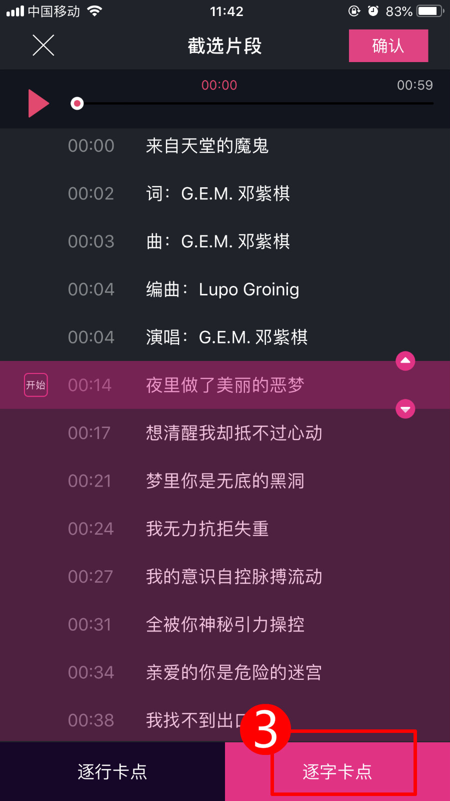 3、在此页面选择需要的歌词,选好后点“逐字卡点”,如下图所↓