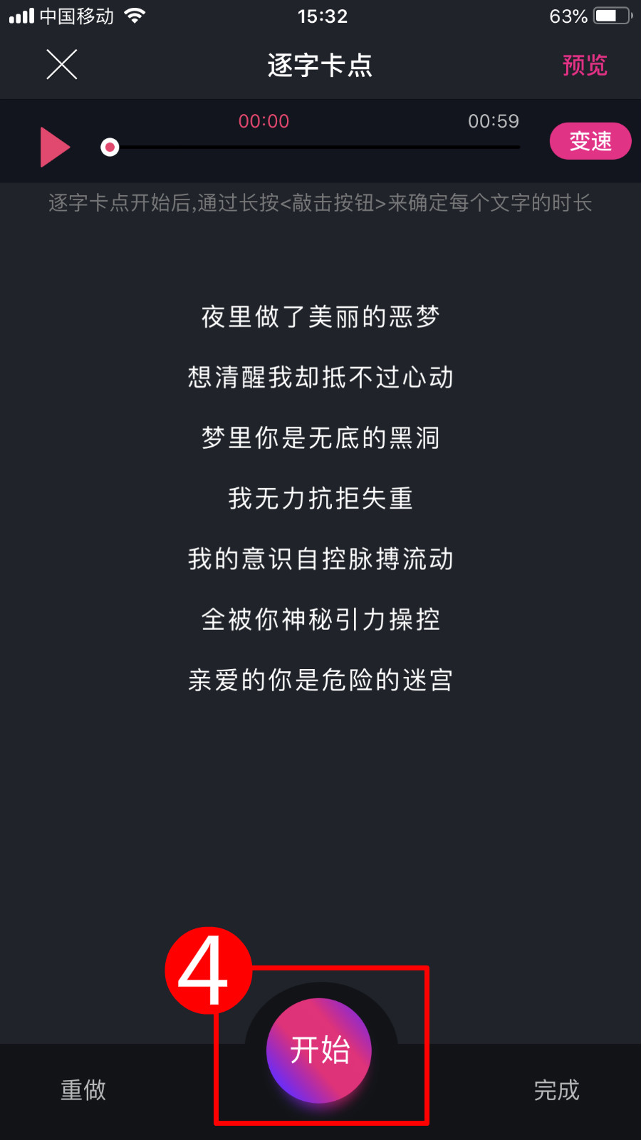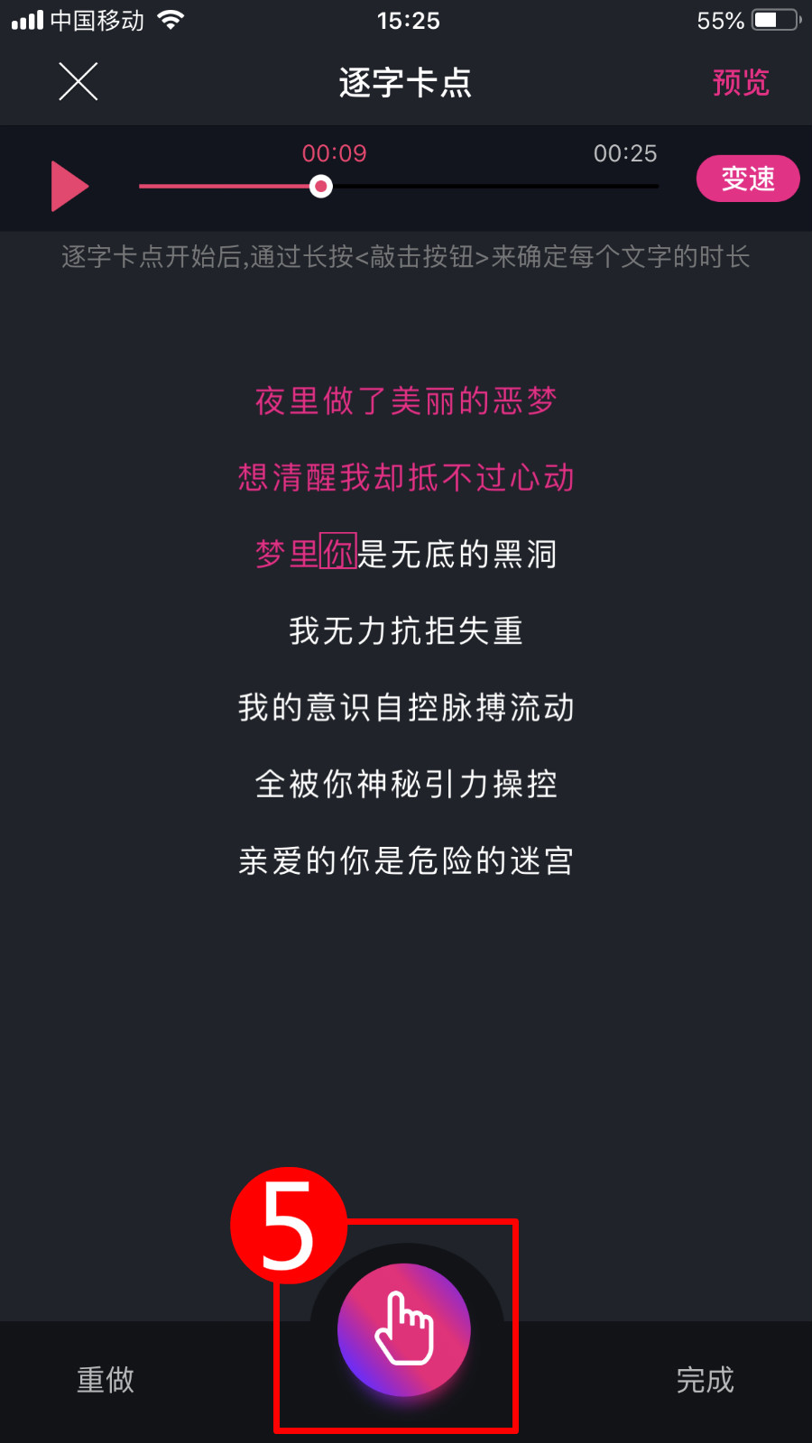 5、在开始逐字卡点后,根据音乐歌词的节奏来长按敲击下方的手势按钮来确定每个文字的时长,若卡点错误可以点击“重做”,卡好后可点击“完成”,如下图所示↓