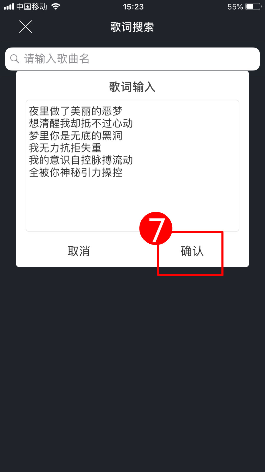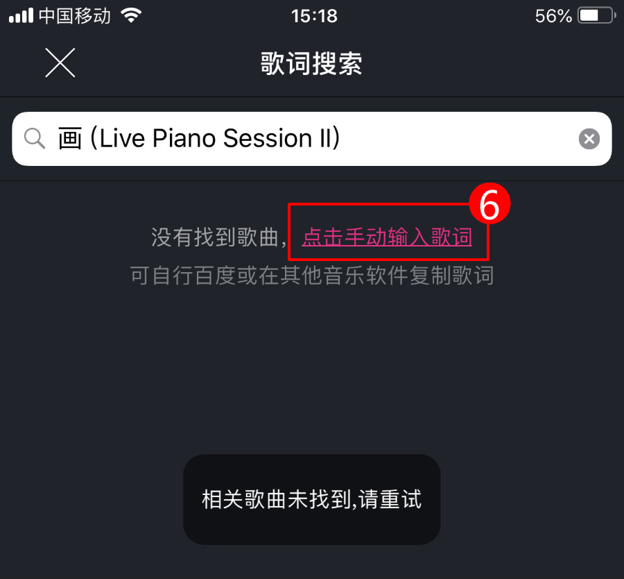 6、若在歌词搜索页面出现“歌曲未找到”提示,可点击手动输入歌词,如下图所示↓